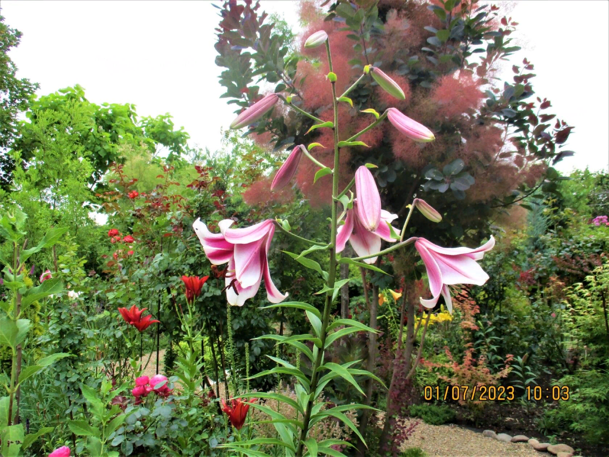 Июль- время цветения лилий в моём саду. Розы после буйного цветения в мае - июне, сейчас отдыхают, набираются сил, выросли новые побеги , которые через некоторое время снова зацветут. Многие кусты уже начали цвести по второму кругу. А пока прогуляемся по саду и посмотрим, как сад выглядит в июле. Напомню, что сад находится в Краснодарском крае и площадь сада 20 соток. На фото лилия "Фризо" сейчас высотой около 1,8 м. За лилией скумпия "Фоллис Пурпуреус". В некоторых местах сада ещё цветут азиатские лилии, но в основном они уже отцвели.