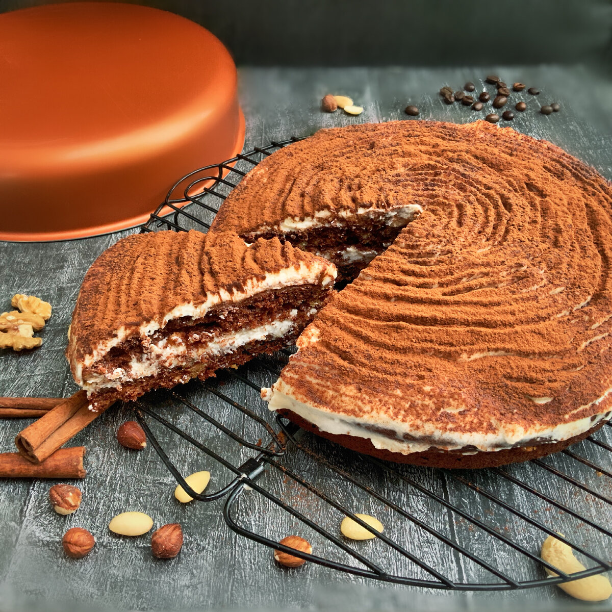 ⠀Выпекаем корж в форме для выпечки Калитва, разрезаем его пополам, даём остыть и смазываем кремом, разделённым на равные части, внутри и сверху. Сверху присыпаем какао-порошком. Очень быстро и вкусно! А ром и марципан гарантируют вам изюминку к вечернему чаепитию!