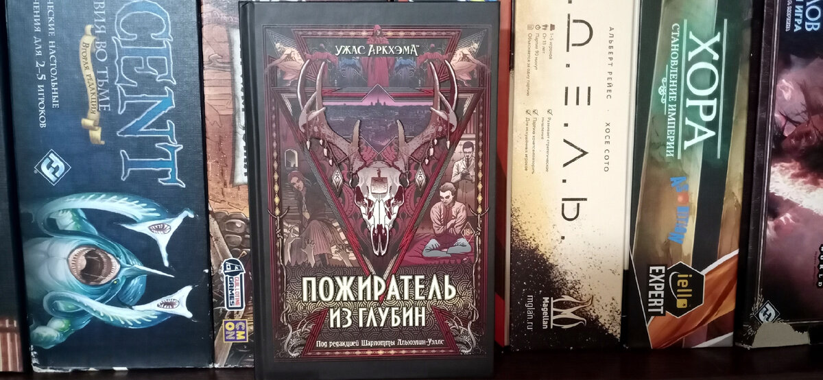 Вы можете сказать, что художку по настолкам писали и раньше, и будете правы. Есть чёрный-чёрный город, где на чёрной-чёрной улице стоит чёрная-«Black Library». Есть «Забытые Королевства», вокруг которых до сих пор пишут книги. Но это варгеймы и НРИ. Честно говоря, именно по классическим настолочкам литературы не встречал. А тут даже дали возможность подержать в руках и почитать — спасибо «Hobby World» за это. Сегодня разбираем «Пожирателя из Глубин». Это книга по карточному «Ужасу Аркхэма» (не путайте с третьей редакцией).
