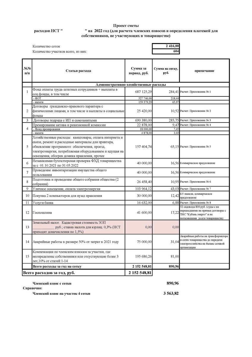 Штатное расписание № 1 - утверждено общим собрание НСТ 22 августа 2021 года. При расчете фонда оплаты труда (ФОТ) штатных сотрудников на 2022 год учтены 6 месяцев фактических выплат заработной платы председателю и отчисления в социальные фонды.