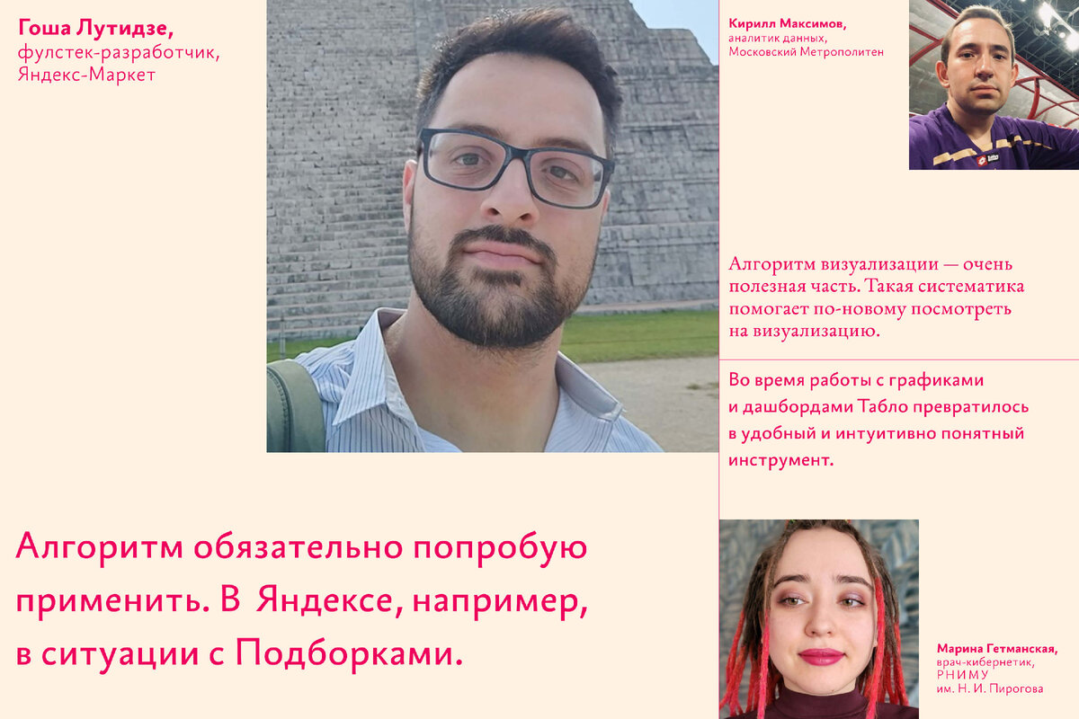 На странице практического курса Тани Мисютиной и Ромы Бунина «Визуализация данных» опубликовано 8 новых отзывов. Ближайший курс пройдёт в дистанционном формате 7—28 июля. Запись на курс открыта до четверга 6 июля. Успейте записаться! Авторы курса — Таня Мисютина и Рома Бунин. Таня — руководитель Лаборатории данных, преподаватель Школы дизайнеров и когда‑то первая сотрудница бюро. Рома — биай‑евангелист Яндекс‑облака, автор канала Reveal the Data и преподаватель Школы дизайнеров. На курсе Таня и Рома учат делать кайфовые информативные визуализации, как в Лаборатории данных, систематизируют имеющиеся у участников знания и опыт, и закрепляют новые навыки с помощью BI‑инструмента Табло. Прочтите отзывы, если сомневаетесь, стоит ли идти на курс. Мы публикуем все отклики, даже негативные. Кстати, если вы написали отзыв, но его нет на странице курса — пришлите нам, мы опубликуем: courses@bureau.ru Записаться на дистанционный курс 7—28 июля