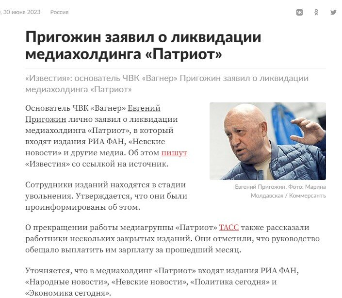 После событий 24 июня прекратила свое существование контролируемая Евгением Пригожиным и финансируемая из бюджета медиагруппа "Патриот". В нее входили ряд новостных изданий, которые быстро заблокировал Роскомнадзор, а также всем известная "Фабрика троллей". О прекращении работы компании заявил лично госп. Пригожин, а также сотрудники самой компании, которые сейчас увольняются и ждут выплаты зарплаты за последний месяц работы. Российские СМИ начали открыто публиковать статьи на закрытую ранее тему: историю создания и развития фабрики троллей, рассказывать, что она создавалась с целью поддержки российских властей и борьбы с оппозицией, как она превратилась в огромный медиа-холдинг и т.д. Но я хотел бы обратить внимание на то, что с закрытием данной структуры и количество троллей на Дзене заметно уменьшилось, а вместе с ним - и количество просмотров/дочитываний публикаций. Ранее я действительно наблюдал у себя на канале немало представителей, судя по всему, данной "фабрики медиа", единств