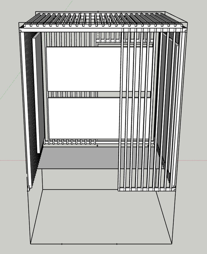 Опять переехал, поэтому сделал новую студию. Перед отъездом сделал чертёж. Решил сделать обрешётку всех стен брусом 20*40мм. Планировалось, что они будут играть роль диффузоров, рассеивая эхо, сохраняя при этом звонкость. И вот я на новом месте, пилил, делал пазы, прикручивал брус. Потом сделал акустические панели из уже давно полюбившихся мне хлопковых плит и чёрного плотного (100г/м3) спанбода. Всё развесил. Красиво. Начал записывать и слышу бубнёж. Гул какой-то. Стал записывать, сидя в центре комнаты, а не у стены, как раньше. Немного помогло. Пару дней так позаписывал, но не выдержал, стал переделывать конструкцию. Сначала пришла мысль, что дело в вертикальных брусах. Открутил их (а как много сил и времени я потратил на их выпиливание и установку...) Стало чуток получше, но несущественно. Потом подумал, что ДВП листы, прикрученные сзади панелей, резонируют как мембраны. Открутил их, т.е. теперь в моих панелях нет задней стенки. Стало опять чуть лучше. Но визуально стало уже некраси