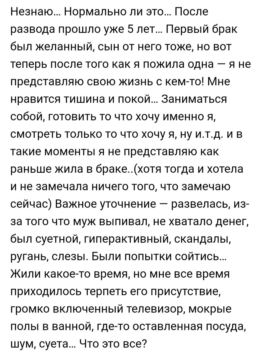 Тяжело даются расставания. Место после "ожога" теперь уже навсегда — шрам. Вроде прямо сейчас не болит, но помнишь о боли, и настигает уже фантомная боль. Возможно ли справиться? Посмотрим на историю одной девушки ⬇️ Важно понять — для чего нужен новый брак. Конкретно, что он даст. Если хорошо жить одной с ребёнком, всё устраивает, то может и не грызть себя за отсутствие желания жить еще с кем-то? У каждого свой временной интервал переживаний. Кто-то и через месяц после развода хочет почувствовать себя привлекательным и интересным у противоположного пола. Например, если прошлые отношения занижали самооценку, подавляли волю к развитию и жизни в целом. А новый избранник дает почувствовать, что на самом деле ТЫ лучше, чем о себе думаешь😊🙏 Но если этого не хочется. Именно нет настроения идти на свидание, нет, даже бежать на встречу с симпатичным мужчиной! 💃 Бежать в новый ресторанчик с джазом, принимать комплименты, и видеть заинтересованный взгляд — если этого не хочется, то и не нужн