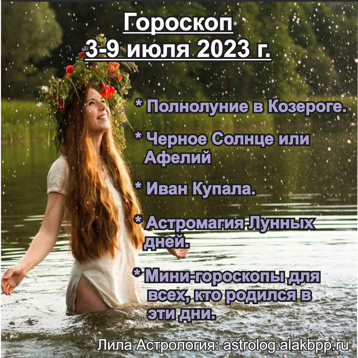 Гороскоп 3-9 июля 2023 г.. Неделя Полнолуния и волшебных праздников. ЗДЕСЬ ВЫ УЗНАЕТЕ СЛЕДУЮЩЕЕ: Астропрогноз на 3-9 июля 2023 г. Мы входим в очень насыщенную самыми разнообразными и противоречивыми событиями неделю. 3 июля состоится Полнолуние в Козероге на соединении с Меркурием, что акцентирует наше внимание и события на сферах коммуникаций, общения, передвижений. Также важными станут вопросы карьеры, престижа, управления, с одной стороны, и семьи, рода, хозяйства, наследства и наследственности, с другой. 6 июля состоится очень важное астрологическое и астрономическое событие, называемое Черным Солнцем или Афелием - днем великих соблазнов, активного обострения в человеке всего темного, связанного с отсутствием любви, деструктивом, ложью, лицемерием, обманами. А с 6 на 7 июля произойдет древний ведический праздник Ивана Купалы или Купало, который также совпадает с открытием галактического портала: Сириус / Вега+Альтаир. Кроме этого, в карте множество противоречивых аспектов, раскры