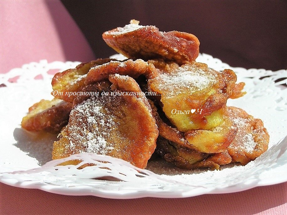 сахарная пудра для посыпки Приготовление: Смешайте все сухие ингредиенты. Добавьте воду и хорошо перемешайте. Яблоки очистите, нарежьте дольками или произвольно. Каждый кусочек обмакивайте в кляре и по несколько штук жарьте во фритюре до румяности. Выкладывайте на бумажное полотенце, чтобы избавиться от лишнего жира. Посыпьте сахарной пудрой и подавайте! Приятного аппетита!