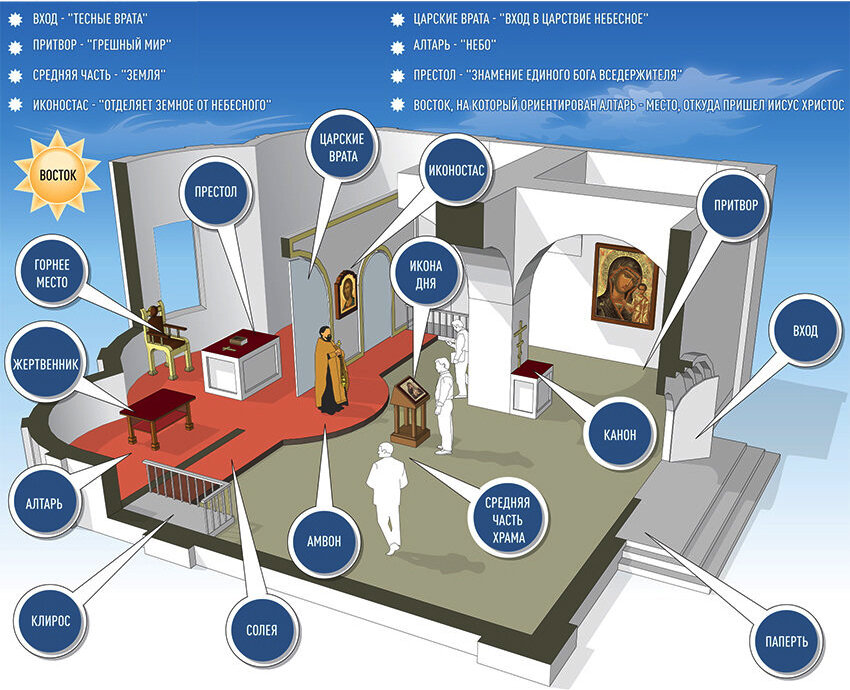 Впечатляющие своими размерами столичные соборы и приземистые сельские церкви — кажется, что в их строении, кроме маковки с крестом, нет ничего общего. Но архитектурные формы в каждом из этих примеров подчинены строгой структуре православного храма. Прежде всего, храм ориентирован на совершение Таинства Евхаристии, когда верующие под видом хлеба и вина вкушают Святые Дары, Тело и Кровь Иисуса Христа, соединяясь с Господом. Традиционно православные храмы строятся по образу скинии, устройство которой Бог открыл Моисею три с половиной тысячи лет назад. Похожим образом был устроен и ветхозаветный Иерусалимский храм. Первым же местом совершения христианского Таинства Евхаристии, установления ее, стала Сионская горница, где сам Иисус Христос разделил трапезу со своими учениками. Впоследствии бесчисленные поколения людей, в том числе и наши предки, участвовали в этом Таинстве в самых разных местах. Были и пещерные храмы, и те, что размещались в бывших языческих святилищах, и базилики со множе