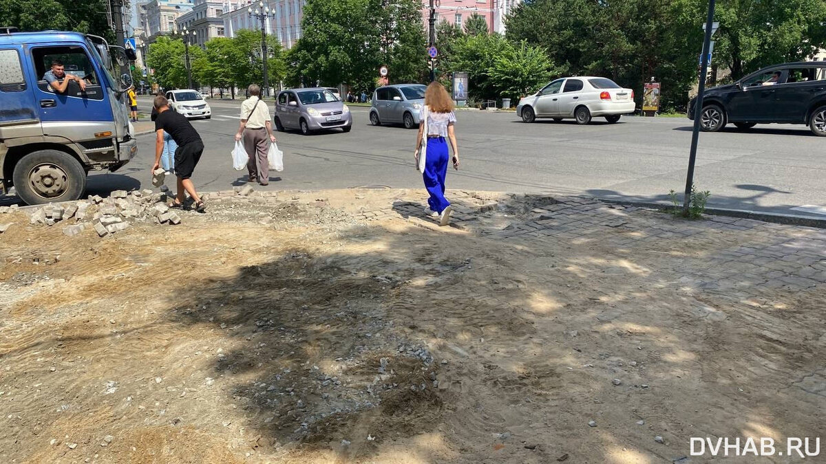 В конце прошлой недели на улице Муравьёва-Амурского началось благоустройство пешеходной зоны в районе Дальневосточной государственной научной библиотеки. Старую брусчатку, которая давно вздыбилась и местами пошла волной, сняли, чтобы подготовить территорию для укладки новой. Для удобства граждан оставили небольшую часть тротуара, по которой можно пройти до автобусной остановки и пешеходного перехода. Чтобы попасть в магазины, которые расположены в самом эпицентре ремонта, оборудовали дорожки подручными средствами: досками и картоном. Правда, подобные островки обустроили не везде, потому людям приходится набирать в обувь килограммы песка, прежде чем добраться до нужного места. - На переходе, где перекресток улиц Комсомольская и Муравьёва-Амурского, нет мостика, чтобы люди не ходили по песку. В сторону площади тоже ничего нет. Сейчас лето, все в открытой обуви ходят. Не очень удобно передвигаться. Можно было для пешеходов постелить доски, как сделали возле магазинов, - высказалась Наталь