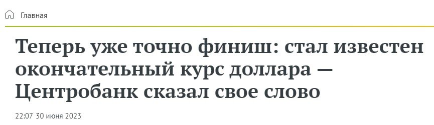 Когда искал информацию по прогнозам валютных курсов на июль, опубликованных в СМИ, наткнулся на вот такой заголовок: "Теперь уже точно финиш: стал известен окончательный курс доллара — Центробанк сказал свое слово". Попробуйте себе представить: о чем говорится в этой статье? У меня, имеющего уже немалый опыт чтения подобных мыслеизлияний, мелькнуло сразу несколько вариантов, но ни один из них не был даже близок к тому, что там реально написано. Итак, попробовали угадать? Хорошо подумали? Точно? А теперь давайте проверим результат. По факту там написано, внимание... об установке официального курса ЦБ на выходные!!! И ни о чем больше! Вот вся новость: Да, действительно, это уж точно финиш. По-другому и не скажешь. Попадались мне тут и "сокрушительные" прогнозы, и "мрачные", и "неутешительные", и "неожиданные", и какие угодно еще, но такой "окончательный" - впервые. Спасибо изданию за "окончательный курс доллара" и поднятое настроение, которым решил поделиться и с вами. Ваш лайк и подписк