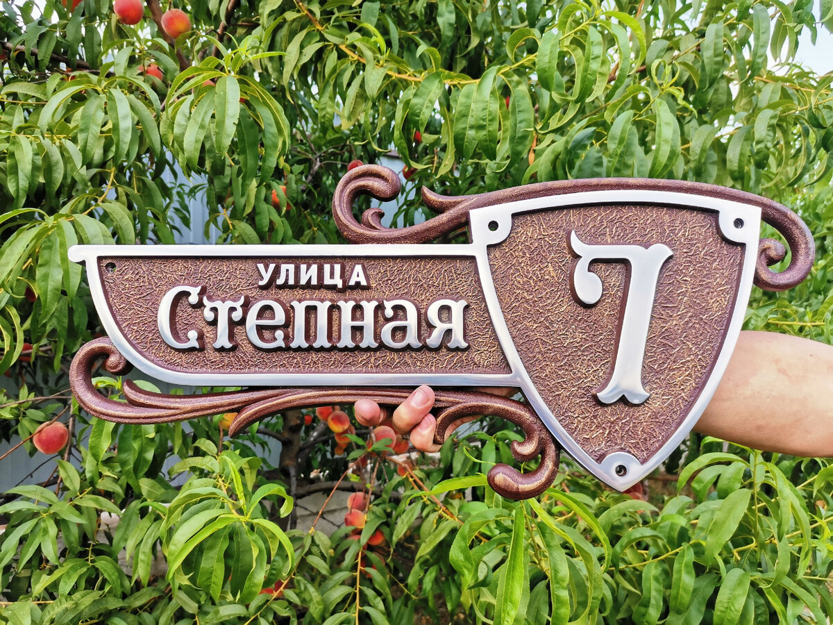 - Сомневаетесь, в каком металле и цвете табличка будет смотреться лучше всего в рамках заданного экстерьера? Пришлите нам фотографию стены вашего загородного дома или окружающего участок забора, и мы дадим рекомендации по выбору размера, цвета и фактуры фона таблички.