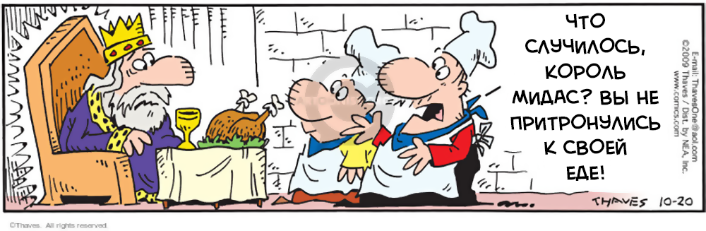 Еще один классик жанра комикс-стрипов - американский художник Марк Париси (Mark Parisi) - в рамках своей серии Off the Mark («Не по адресу») тоже решил немного пошутить на тему чудесных способностей короля Мидаса.