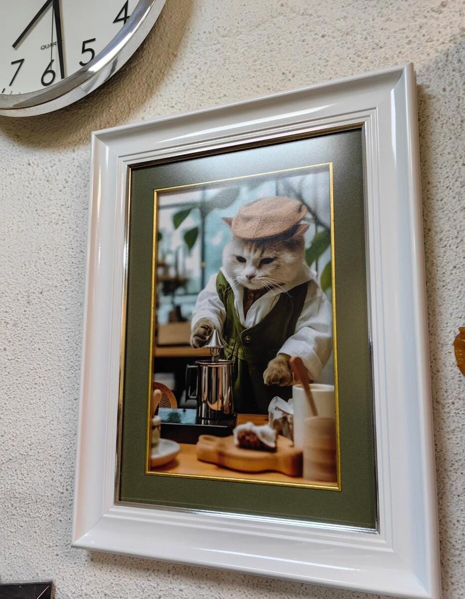 Как мы уже говорили ранее, сегодня вряд ли кого-то удивишь тем, что компьютеры, по средствам нейросети, научились самостоятельно писать картины по Вашему техническому заданию. Рассказывали про целое направление и группы, посвященные этой тематике и даже приводили пример нашей собственной пробы пера по средствам нейросетей. И все же, все эти результаты, до недавнего времени, оставались лишь цифровым изображением на жестком диске. Но, технология получила настолько взрывной рост популярности, что сегодня мы уже можем Вам показать примеры багетного оформления таких работ, при чем с очень даже высокой степенью проработки сюжета и деталей изображения. И так, друзья, это кот бариста, который своими мягкими лапками делает воздушный капучино для вас! Помимо высокого качества самого портрета, подчеркнуть все его лучшие качества помогает оформление в багет с паспарту и кантом. Так что, если Вы достигли высот в творчестве по средствам нейросетей и хотели бы оформить свои лучшие работы, мы будем