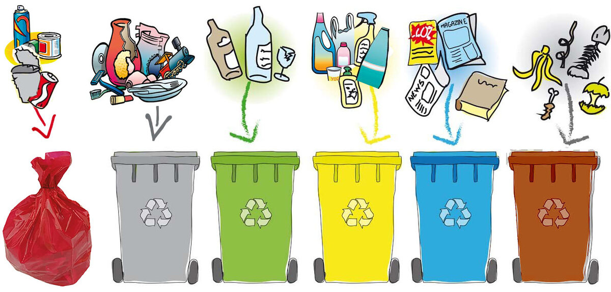 На картинке представлено больше баков, но в нашем муниципалитете разрешается собирать пластик и металл вместе.