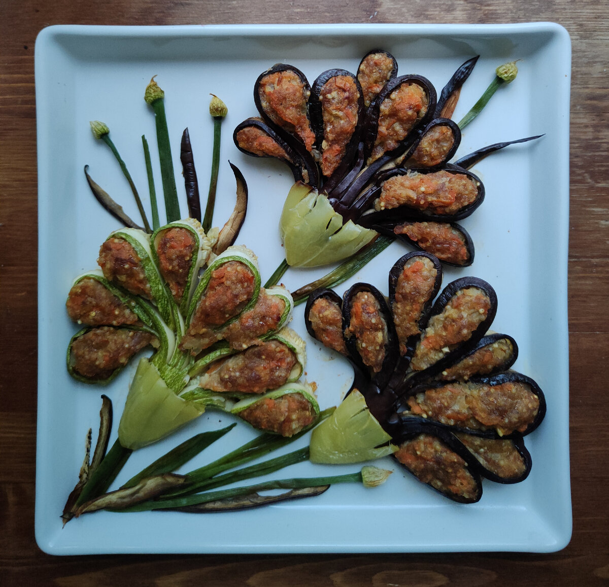 Приветствую вас! Сегодня хочу предложить вот такое симпатичное блюдо для семейной трапезы. Ингредиенты: Фарш говяжий 200 г, лук репчатый, морковь, перец зелёный, кабачок и баклажан - по одной штуке среднего размера, пшено - 1 ст. ложка с горкой, чечевичная мука - 2 ст. ложки (муку молола сама из красной чечевицы в кофемолке), стрелки зелёного лука, 2 зубчика чеснока. Лук мелко нарезать и припустить на сковороде. Морковь натереть на тёрке и добавить к луку, немного потушить, затем добавить фарш и готовить ещё пару минут. Выложить в тарелку, смешать с пшеном и мукой, мелко нарезанным чесноком. Добавить специи по вкусу. Кабачок и баклажан разрезать вдоль на две части и нарезать тонкими пластинами (не более 2-3 мм толщиной), не дорезая до конца 3-4 см. Закрутить пластины внутрь. Если получается много "лепестков", часть можно вырезать. Если "лепестки" не держатся, скрепить зубочисткой. Баклажаны лучше брать длинные и не "пузатые", а примерно одного диаметра по всей длине. Зеленый перец разр
