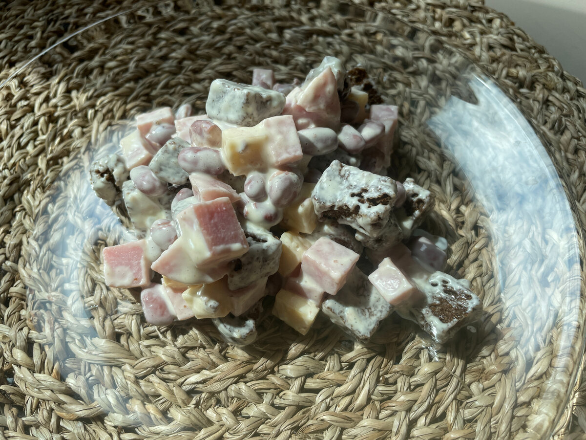 Очень вкусный и простой салат. Возможно он вам знаком, а может станет откровением Ингредиенты: Ход приготовления: Хлеб режем на кубики и перекладываем в пакет Выдавливаем чеснок и добавляем растительное масло Завязываем пакетик и хорошенько трясем Выкладываем кубики хлеба на противень и убираем в духовку на 30 минут при температуре 150° - хлеб должен подсушиться и превратиться в сухарики В то время, пока хлеб сушится из фасоли сливаем жидкость, откинув на дуршлаг Ветчину нарезаем на кубики Сыр режем на кубики, аналогично хлебу Но, если вы не любите сыр, то можно и не класть Выкладываем всё в миску Добавляем майонез. В идеале взять домашний Перемешиваем и наслаждаемся Если готовить с любовью, то и аппетит будет приятным!