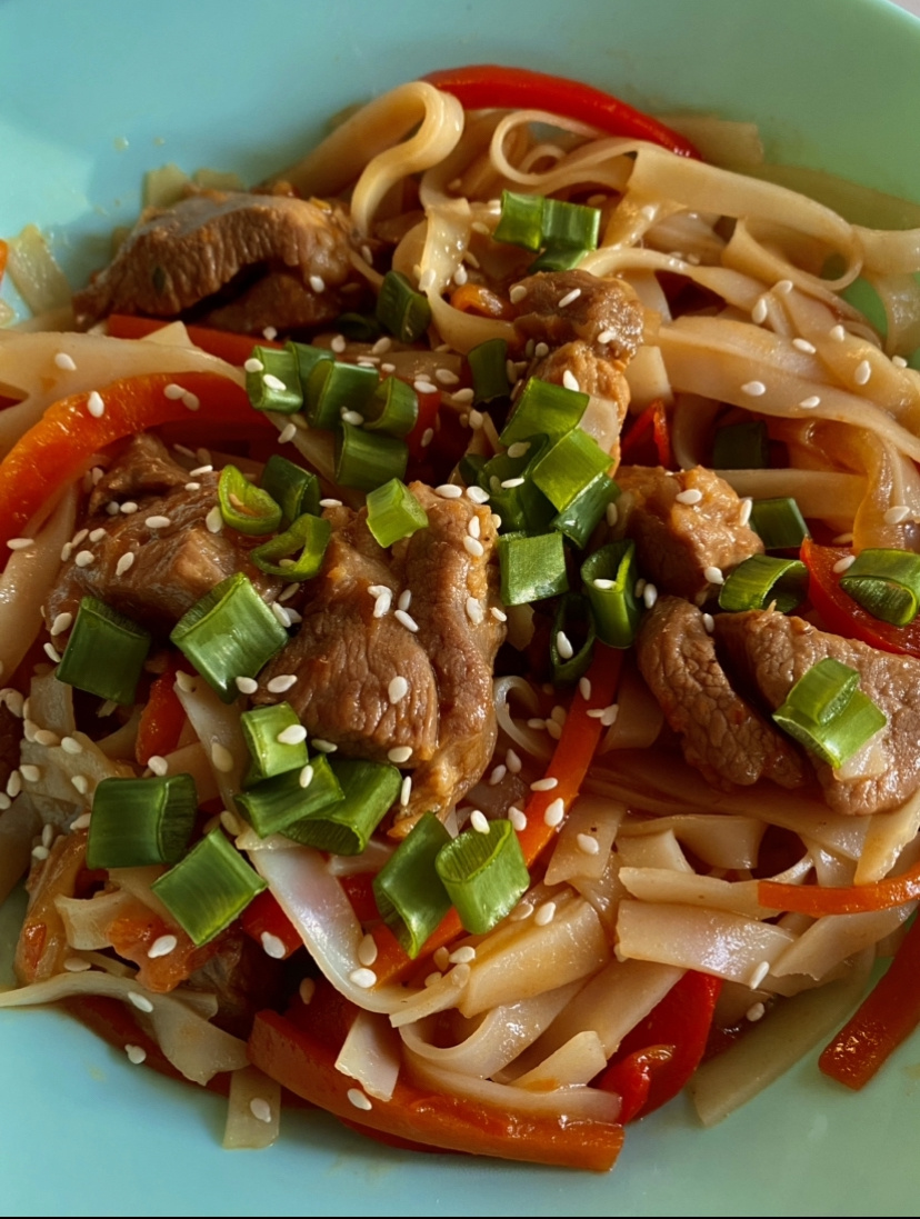 - нарезать свинину на тонкие полоски, обжарить с добавлением масла до полуготовности, отварить лапшу без добавления соли