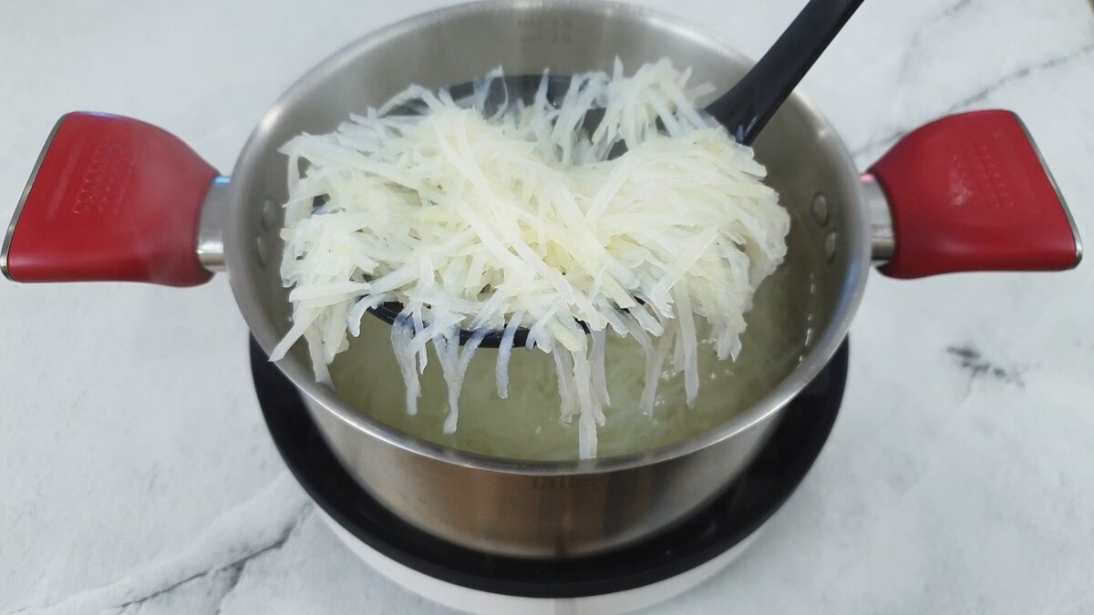 Как готовить: Берем 3-4 сырых картофелины общим весом 500 граммов. И натираем их на тёрке для морковки по-корейски. Перекладываем натертый картофель в миску и заливаем холодной водой. Оставляем картофель в воде на 10 минут. Берем небольшой кусочек свинины весом 250 граммов. И нарезаем его на небольшие полоски. Обжариваем свинину в растительном масле на сильном огне. Солим и перчим мясо. Две средних луковицы нарезаем на полукольца. Отправляем нарезанный лук в сковороду к свинине. Обжариваем на сильном огне несколько минут. Затем огонь уменьшаем, накрываем крышкой и готовим еще минут 5-7. В кастрюлю наливаем 1,5 литра воды и даем закипеть. Добавляем столовую ложку 9% уксуса и чайную ложку соли. Когда вода вновь закипит, перекладываем в кастрюлю натертый картофель. Варим картошку ровно 4 минуты. Затем вынимаем картофель шумовкой и перекладываем в салатницу. Туда же кладем обжаренную свинину с лучком. Пропускаем через пресс 2 зубчика чеснока. Вливаем 3 столовых ложки соевого соуса. И пере