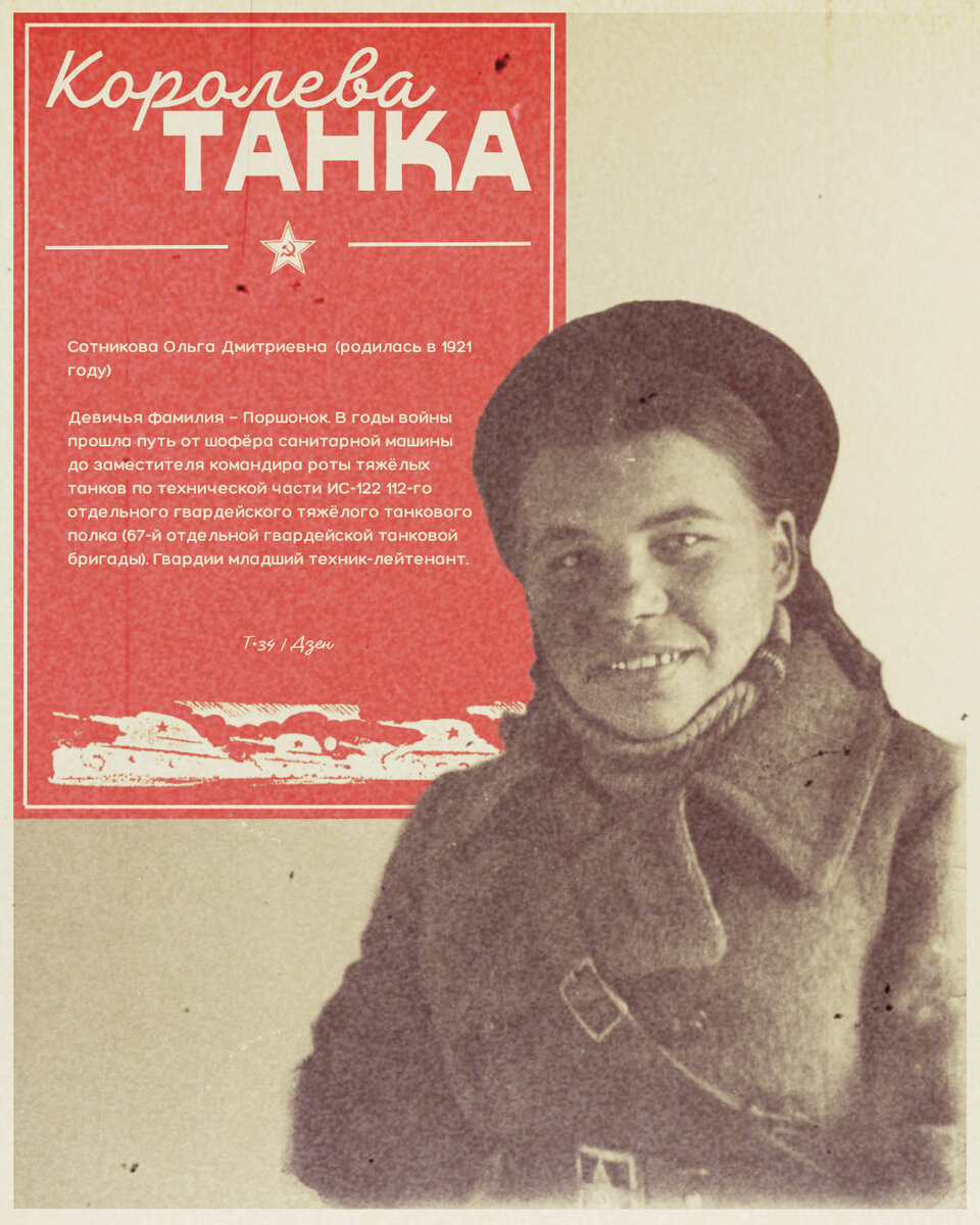 - «Королева танка» — так писали о ней в своих воспоминаниях однополчане. От Ленинграда через Сталинград до Берлина, где оставила на рейхстаге свой автограф — таков боевой путь механика-водителя танка Ольги Дмитриевны Сотниковой (Поршонок). Уроженка Ленинграда, Ольга Дмитриевна в первые дни войны добровольно пришла в военкомат и заявила: «Хочу сражаться за родной город. Вожу автомашину. Могу танк»...