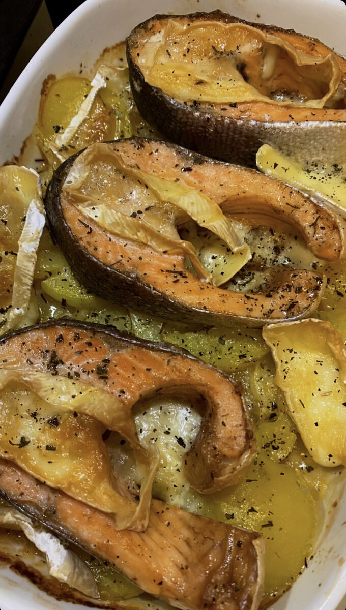 - полить рыбу и картошку этим соусом, сверху выложить сыр, нарезанный пластинами