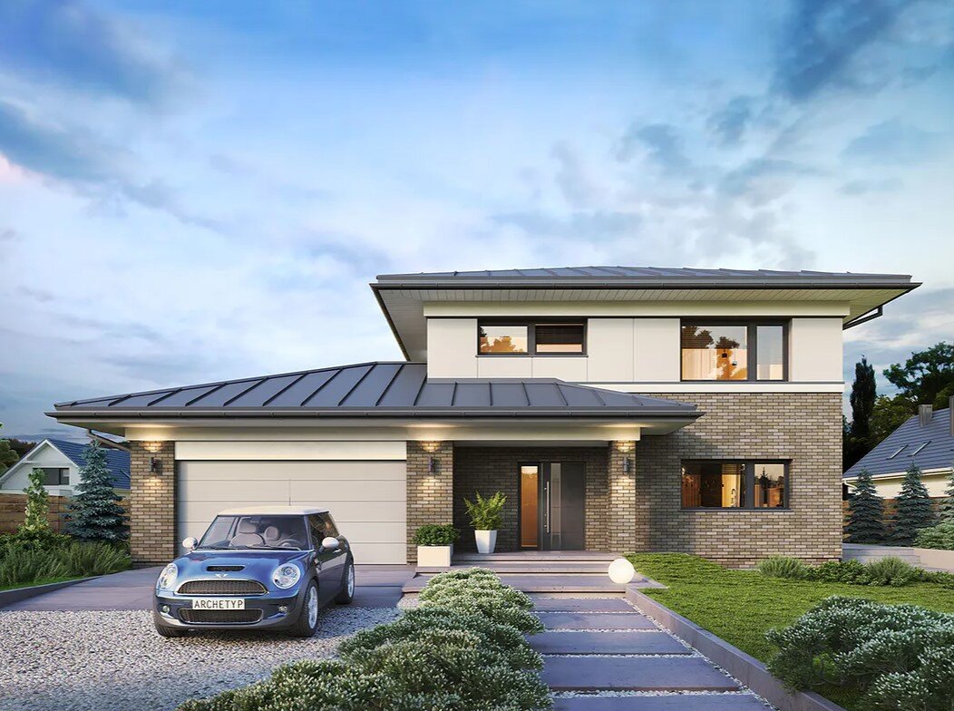 Проект двухэтажного дома с гаражом предлагает комфортное и функциональное пространство для семьи. Он имеет общую площадь 120 м2 и габариты 14,4 x 12,8 м. Планировка дома предусматривает три спальни, что идеально подходит для семьи с двумя детьми. Одна из спален оснащена гардеробом для удобного хранения одежды и личных вещей. В доме также предусмотрены два санузла. Кухня-гостиная является центральным пространством дома и совмещена с открытой террасой. Это обеспечивает удобство при приготовлении пищи и общении с семьей и гостями. В доме также предусмотрен гараж на одно машиноместо, с выходом из него в дом через котельную. Это позволяет удобно парковать автомобиль и иметь прямой доступ к дому. Стены дома выполнены из газобетона толщиной 400 мм, что обеспечивает хорошую теплоизоляцию и звукоизоляцию. Кровля дома имеет скатную форму и покрыта мягкой битумной черепицей, что обеспечивает надежную защиту от атмосферных осадков. Фасад дома выполнен в спокойных светлых оттенках с использованием