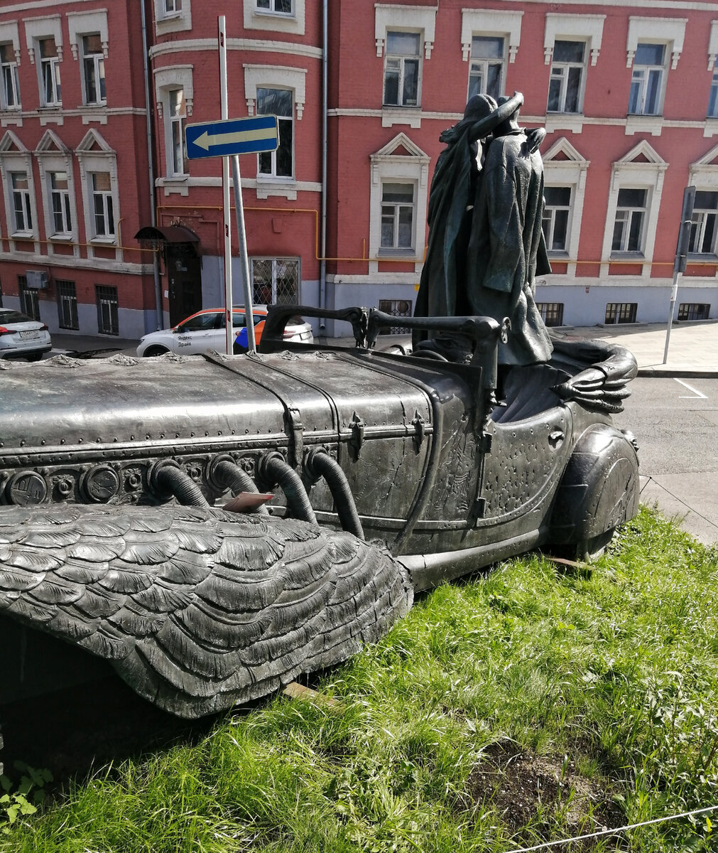 Этот памятник может поспорить за призовое место в конкурсе "Самый оригинальный памятник в столице, если такой конкурс будет проводиться. Памятник посвящён памяти Булгакова и изображает Мастера и Маргариту в машине Воланда. Необычно и место установки памятника - на очень шумном Садовом кольце между Таганкой и Курской. Здесь гуляют только местные жители, а машины просто мчатся мимо. Авторы памятника - Рукавишников, Шаров. Хотели установить его ещё в 2003 г. на Патриарших, но не удалось. Возможно, что местные жители были против. Памятник такой необычный, что стОит его обойти со всех сторон и рассмотреть все детали. Ворон - за рулём автомобиля, обнимающиеся Мастер и Маргарита, патиссоны - выглядывающие из выхлопных труб (на фото выше), крыло - в виде крыла ворона, вместо фар - рука, показывающая лампочки. И ещё много деталей, которые стоит увидеть лично Адрес: ул. Земляной Вал, 52соор1 Спасибо, что дочитали. Это была публикация из рубрики "Памятники Москвы", которая выходит на нашем канал