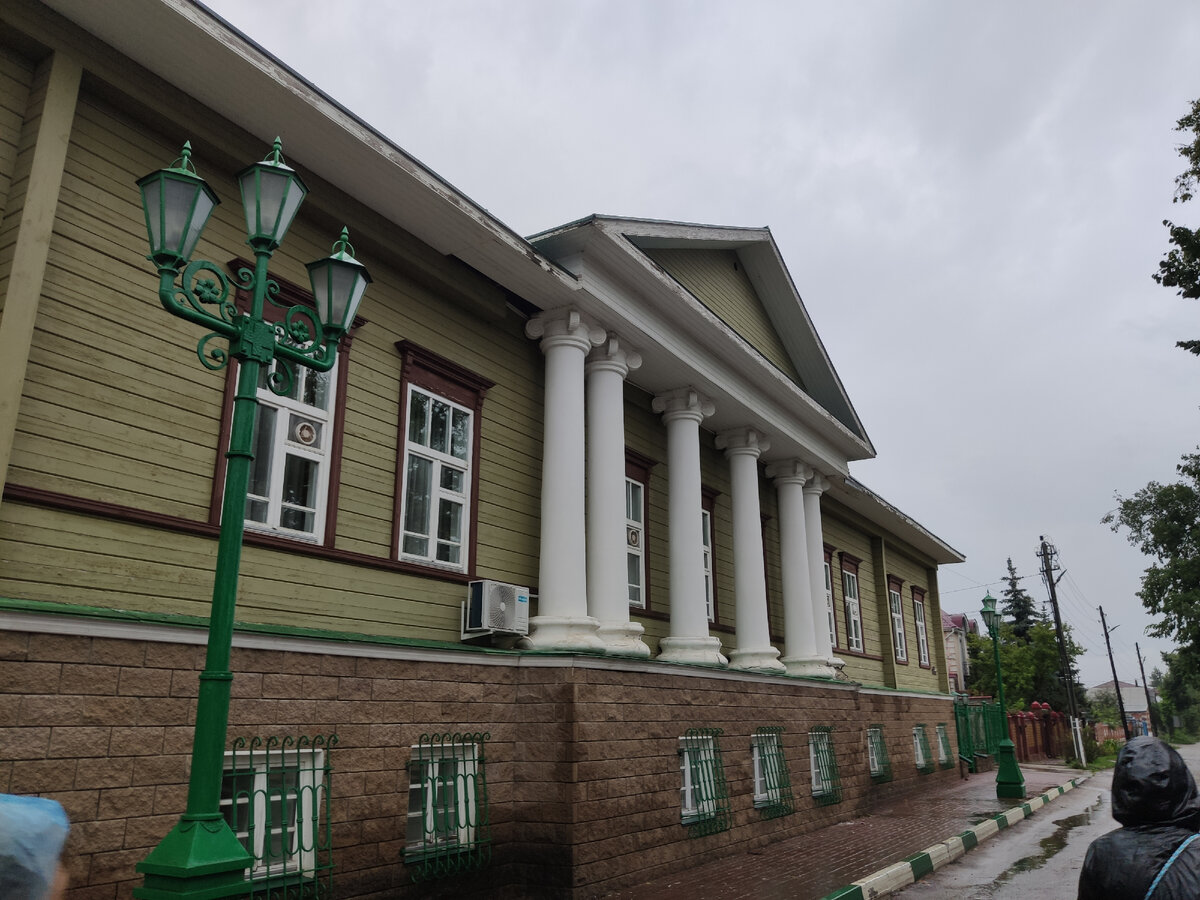Двухэтажный купеческий дом Хомякова (или дом Ханыкова) удивил меня своим закруглённым фасадом, обшитыми деревом колоннами и аркой с окном наверху. У дома богатая история: он принадлежал помещику, крестьянину, позже здесь размещались женская гимназия, школа и, наконец, он стал обычным (или необычным?) жилым домом.