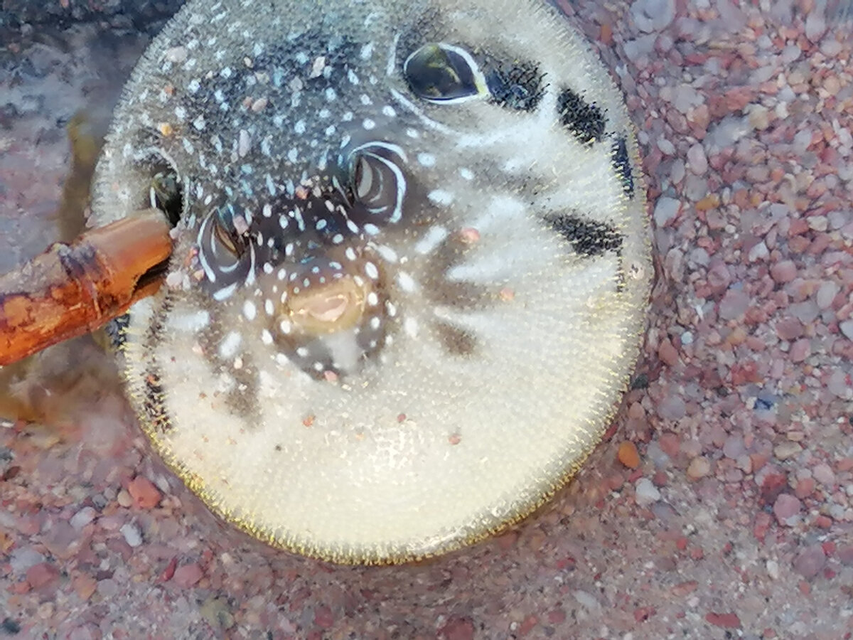 Сегодня на пляже раздался крик моего ребенка:"Маааамааа! “ Естественно, я побежала на крик." Смотри, какую тварь я поймала". Играла с сачком и поймала. Из бурного рассказа стало понятно, что рыба обычная вдруг раздулась, продвинутая рыбака сказала, что это фугу, они" по биологии проходили". Пока мы на неё смотрели, она ещё поднапряглась, зашипела, стала плеваться водой в стороны, сдулась и попыталась пролезть в дырку в сачке. То есть, резко показала нам свое истинное намерение. Очень испугалась дочка, что ядом плюнет рыба в меня и... .Стала кричать, чтобы я её выбросила. Но я не могла выбросить, пока не отсняла и не сфотографировала. Вот такой синдром блогера. Мы стали опрашивать египтян знакомых и разных дайверов. Мнения разделились. Один серфер Заза сказал что это pufferfish, он безвредный, надувается, когда боится и когда помирать собирается. В целом, нас устроил его ответ. Но было интересно узнать что-то ещё и мы стали искать по картинке в поисковиках. Иглобрюх, он же фугу.... Кто