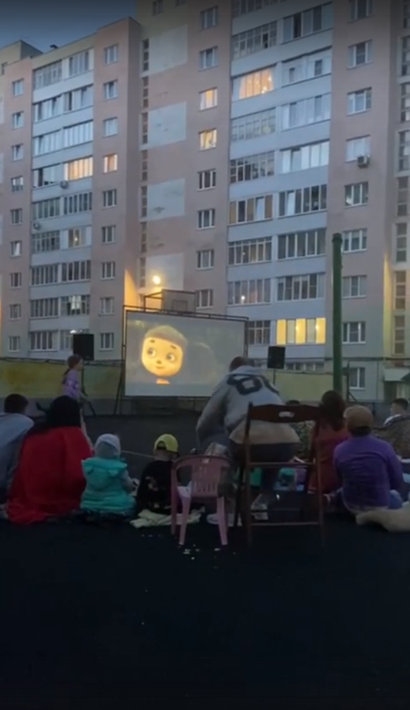 Во дворе многоэтажки смотрят Чебурашку. Обычное место просмотра фильмов на улице Хромова в Твери.