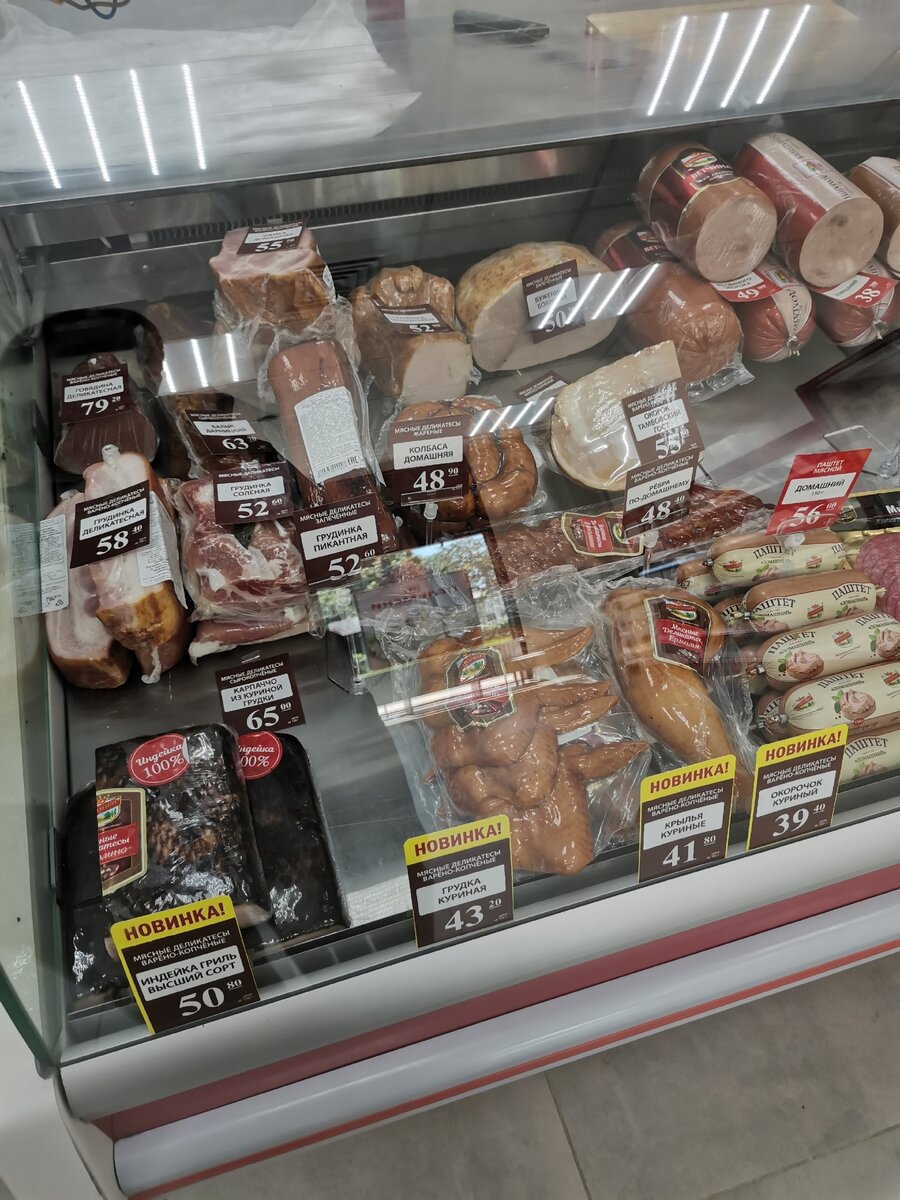 Речь пойдет про кондитерские изделия, однако сначала покажу обновленный ассортимент в холодильнике с мясной продукцией (одни лишь полуфабрикаты так и остались без новинок), ибо в прошлый раз мне попались только ценники, а в этот удалось и вживую увидеть предлагаемую магазином продукцию.