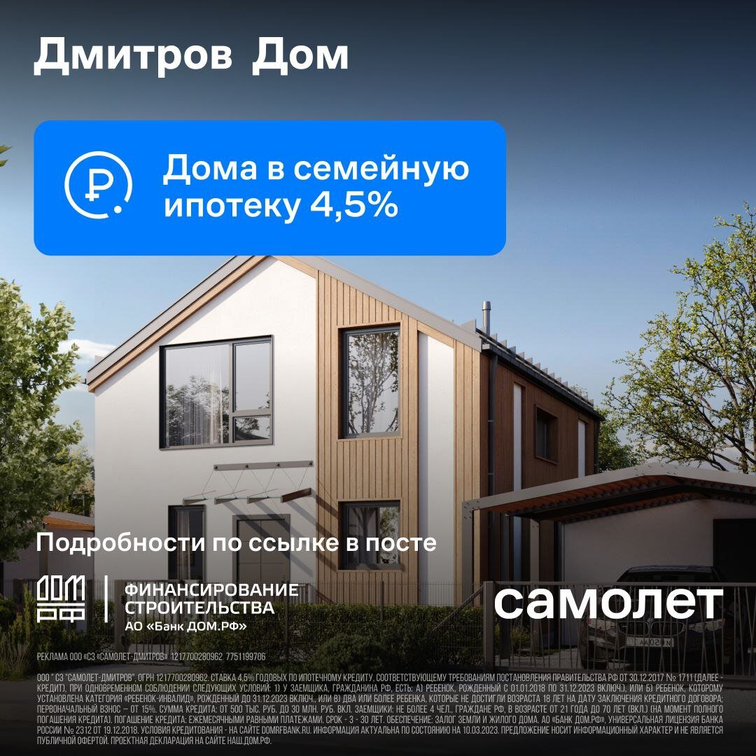 Если вы планируете брать ипотеку и всегда мечтали иметь свой дом, рекомендую обратить внимание на следующий вариант. Сейчас у девелопера «Самолет», возможно одно из самых выгодных предложений по ипотеке со ставкой от 3,7% на дома в проекте загородной недвижимости «Дмитров Дом». Да, в сегмент загородного строительства пришла нормальная ипотека, и есть реальная возможность осуществить мечту о жизни в своем собственном загородном доме не отказываясь от привычного городского комфорта. Кстати, готовность проекта уже в 4 квартале 2023 года — в готовый дом можно будет заселиться уже к концу этого года. Сам проект «Дмитров Дом» находится в Дмитровском городском округе, в 10 км от города Дмитров и в 18 км от горнолыжных комплексов «Волен» и «Яхрома». Идеальное сочетание удаленности от городской инфраструктуры и жизни на природе в своем доме. И интересных вариантов по ипотеке в проекте на сайте представлены: - от 3,7% для IT-специалистов; - от 4,7% для семей с детьми; - 6,7
