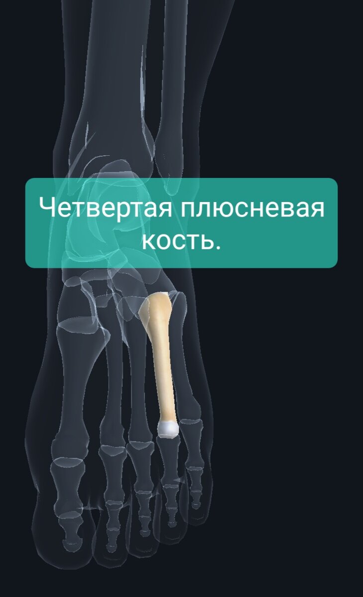 Такая же короткая трубчатая, с такой же формой сечения, как и остальные. Вместе с пятой плюсневой костью "держится" за кубовидную кость. Основные части не блещут оригинальностью: Четвертая плюсневая кость находится в окружении других костей, и относительно неплохо защищена ими. На неё приходится не самая большая часть нагрузки, поэтому "усталостные" повреждения (стресс-переломы) происходят не так часто. Возможны прямые травмы вследствие механических воздействий. Основные методы диагностики - лучевые, как и для других плюсневых костей. За лечением - к ортопедам-травматологам, они определят тактику лечения (консервативно или с помощью операции). В целом, четвертая плюсневая - не очень выдающееся анатомическое образование. Пятая - интереснее. Про нее будет следующий текст.
