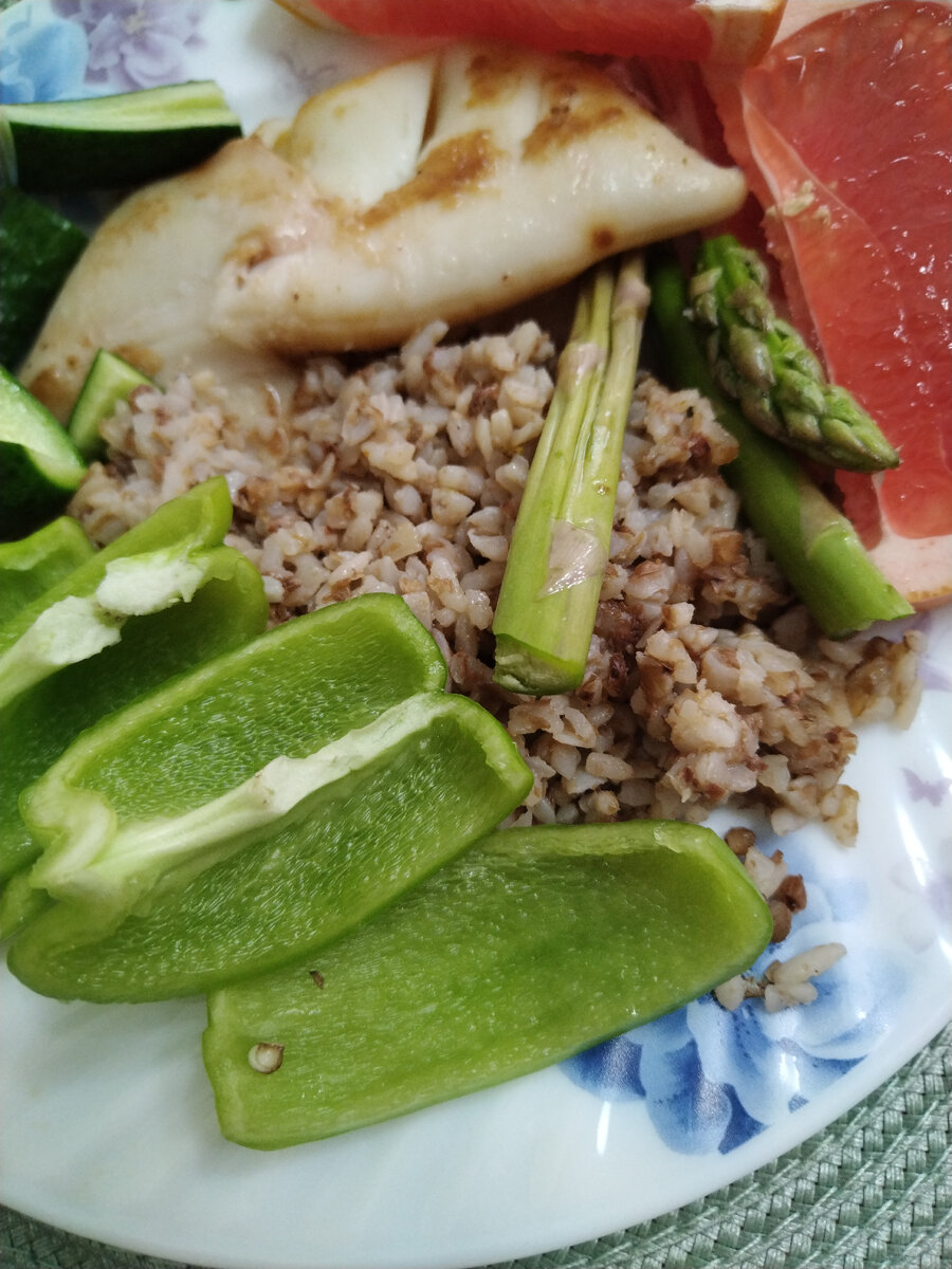 Тушку ральмара обдать кипятком, снять пленку , промыть в внутри и отправить на слегка смазанную сковороду, жарить до золотистого цвета. После на сковороду отправить 3 стебля спаржи и обжарить 5 минут. Овощи вообще могут быть разнообразны. Ну и три столовые ложки отваренной гречихи, так как при борьбе с лишним весом она необходима в рационе. Сервируем и кушаем.