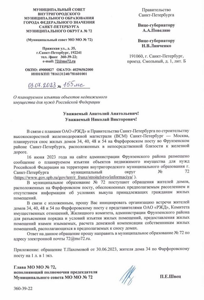 Возглавляющий 72-й муниципальный округ северной столицы депутат Павел Швец обратился к городскому правительству с просьбой дать пояснения по поводу порядка и условий изъятия недвижимости у владельцев квартир в домах исторического квартала Фарфоровский пост. Власти намерены снести их ради осуществления амбициозных строительных планов: речь идет о проекте под названием «Высокоскоростная железнодорожная магистраль» (ВСМ). Для ее прокладки и планируется снос четырех жилых домов в этом районе. - Обратился к вице-губернаторам, курирующим Жилищный комитет и Комитет имущественный отношений, Анатолию Повелию и Николаю Линченко, с просьбой организовать встречу с жителями Фарфоровского поста, чьи дома собирается снести РЖД, - рассказал депутат. – Чтобы жителям разъяснили порядок изъятия имущества, условия предоставления компенсаций и предоставления нового жилья. Обращение П. Швеца к вице-губернаторам. Источник ТГ-канал "Депутат Павел Швец" Кроме этих профильных чиновников, Швец хотел бы пообщатьс