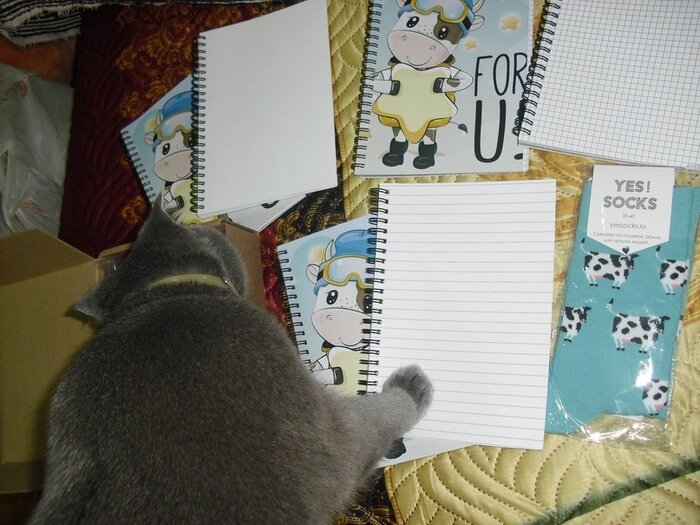 Пока мой подарок из Книговорота уже неделю как завис где-то по дороге из сортировочного центра в Белогорске я вспомнила, что не сделала отчет по подарку от альтруиста по другому обмену, который получила еще в мае. В отчете проекта носочно-цветочный обмен 3.0: «Весна на пороге» из г.Уфа я написала, что успела нажать на кнопку «Подарок не получен» и только через месяц мне отправил подарок основной отправитель. Видимо, за это время мою анкету выбрал альтруист, но этот момент я пропустила и не знала об этом. В общем, совершенно неожиданно мне снова приходит трек-номер по носочно-цветочному обмену. Но забрать посылку смогла только после возвращения из отпуска. Сначала увидела тетрадь, потом еще одну…в итоге их оказалось аж 6 штук и все с коровкой: по две тетради в линию, клетку и совсем без разлиновки. Для каждой найдется, чем ее заполнить) Также в посылке были носки с коровками и небольшая коробочка с набором разноцветной шерсти для валяния. Милке понравилось как она пахнет, пыталась добра