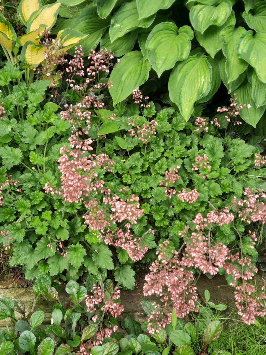Вот зелененькие безымянные - никто не смог предложить реальный вариант - так разрослись, что служат почти заполнителем пустого пространства. Их розовые цветочки сейчас весело цветут. Потом будут просто зеленые кочки. Прекрасно можно летом использовать. Помним, что весной они выглядят так себе, и что периодически надо делить и укоренять.