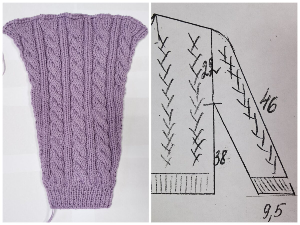 Урок 5. Вяжем рукава. По замерам нам необходима манжета в обхвате 19 см, умножаем на 1,5 (столько петель в 1 см), получается 28,5. Округляем в большую сторону, набираем 30 петель (2 из них кромочные). Вяжем резинкой 1 х 1 10 рядов, в 11-м изнаночном ряду равномерно прибавляем 10 петель (кромочная, прибавка петли из протяжки, 3 петли вяжем по рисунку, прибавляем еще петлю и так далее, через каждые 3 петли до конца ряда). Как прибавить петлю из протяжки: на левую спицу делаем накид нити, которая у нас между петелек, и сразу же провязываем эту петлю лицевой. В 12-м лицевом ряду начинаем узор "Косы". У нас 40 петель, распределяем их так: 1 кром, 2 лиц, 2 изн, 6 лиц, 2 изн, 2 лиц, 2 изн, 6 лиц, 2 изн, 2 лиц, 2 изн, 6 лиц, 2 изн, 2 лиц, 1 кром. Вяжем прямо. По замерам обхват рукава вверху у нас 43-44 см, чтобы узнать сколько прибавить петель, умножаем 43 см на 1,5, получается 64,5 петли должно быть в конце. Округляем до 64, следовательно, нам осталось прибавить 24 петли. Прибавляем с к