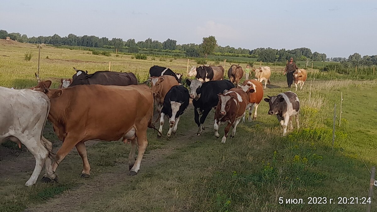 Кое как загнали их в выгул. А бык смотрю не понятно чей. Я у нас такого весной не видала. Может с соседнего села? А потом думаю- одна семья весной своих не выпускала. Может их? Позвонили. Они принеслись. Мы кое как от Масяньки мужика оторвали, помогли от дома отогнать. И все в мыле пошли на дойку.