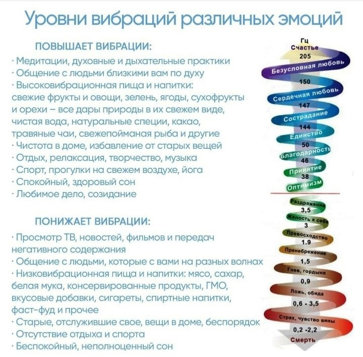 Вибрации (частота) это особая энергия, которая исходит из тебя и которую ты получаешь извне. Существуют низкие и высокие вибрации, и здесь всё предельно просто. Если в человеке преобладают высокие вибрации, он наполнен позитивом и мотивацией. А низкие вибрации притягивают уныние и разочарование в жизни.