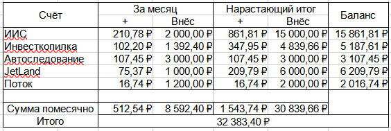 Пополнение в этом месяце не 1000, а сразу 3000, потому как это минималка для запуска. Сидеть смотреть 2 месяца на счёт на котором ничего не происходит, было неохота. Дальше всё будет честно по 1000 в месяц.