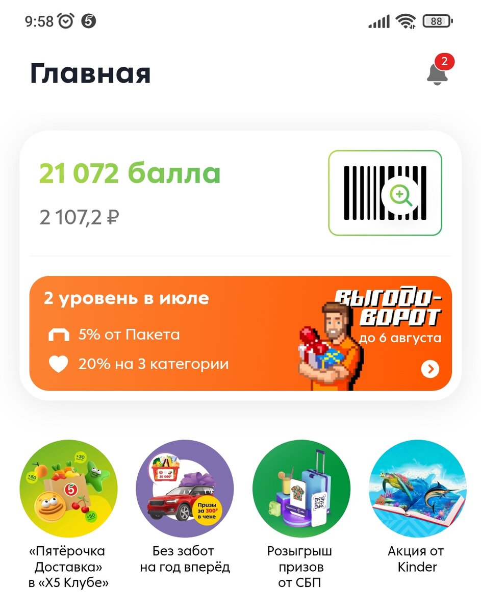Вместо приветствия - сразу, как говорится, пруфы 🤣 с сегодня у меня на балансе карты лояльности от Пятерочки - 21072 балла. Или в простонародье - 2107 рублей скидки. Откуда взялись они? 😁 А я их выиграла в забеге с препятствиями.🤣🤣🤣 А точнее, в конкурсе в телеграмме официального канала пятерочки. Надо было 5 или 7 дней (если не ошибаюсь) боту отвечать на простенькие вопросы - то есть нажимать кнопочки с правильным ответом😁 я и нажимала. Если нажать неправильный, то бот писал - выберите другое. Поэтому жмешь, пока правильный не попадётся 🤣 Ну и по окончании этих дней, рандомно выбирали победителей. Мне достались 20000 баллов на карту. Конкурс закончился 29 июня, а сегодня вот уже появились баллы. Будем тратить их потихоньку (хватит на 10 покупок, если списывать по максимуму каждый раз по 2000 баллов или скидкой 200 рублей с века). Вот такие дела - закупаемся в ближайшее время только в пятёрке 😁 Видели на скрине новую игру от пятёрки в приложении - Выгодо-ворот? 😁 я ещё её