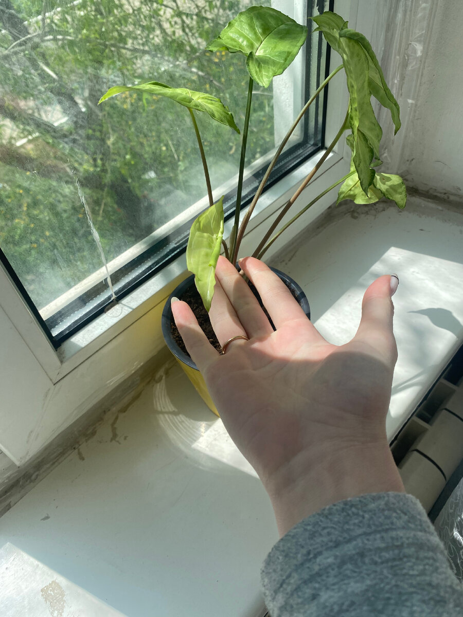 Взяла я как-то месяц назад с авито саженец хамедореи. Я люблю эту пальму, но ей то условия не подходили, то слишком слабый был росток. В общем с третьей попытки я вновь решила выращивать эту пальму. В моем цветнике лучше всего растут сингониумы и сциндапсусы. Вот уж не знаю, то ли они меня так любят, то от они настолько неприхотливы, что готовы расти даже в самых тяжелых условиях. Но растут. На фото сингониум 1,5 месяца назад. Он разросся быстро и я даже отсадила от него «дочку». Сейчас пока что он на подоконнике в маленькой баночке, но думаю уже через пару недель я пересажу его в горшок. А рядом с ним та самая хамедорея, которая за месяц никак не хочет дальше расти, хотя и грунт и условия произрастания я все же соблюдаю в том числе и опрыскивание водой. И сегодня я кажется поняла почему он не хочет давать зелень: моя кошка каждый день охотно «грызет» мою пальму. Листья просто не успевают так быстро отрастать, насколько быстро она грызет концы. Решила я оградить этот цветок от кошки