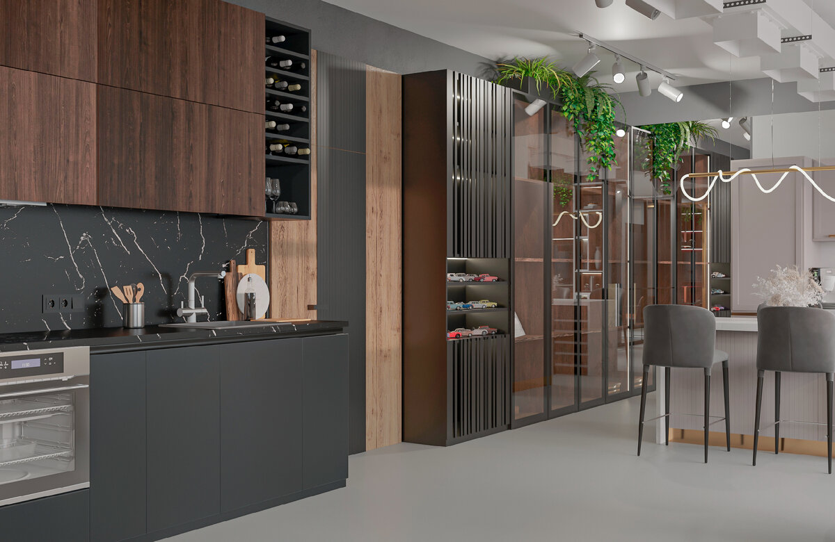 3D визуализация кухни в темных тонах - это современное и стильное решение для вашего интерьера. Темные оттенки придают кухне элегантность, роскошь и уют.
