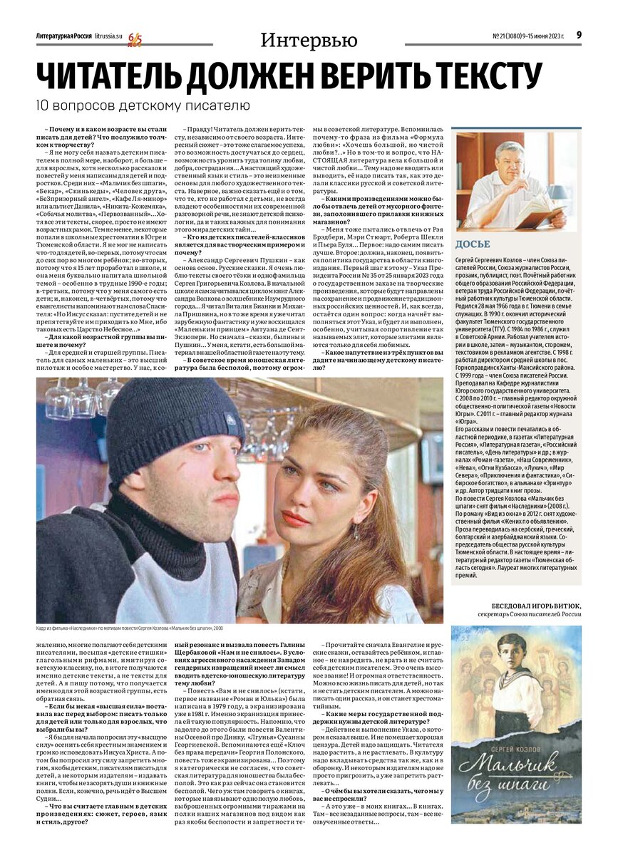 На мои 10 вопросов о детской литературе в интервью газете «Литературная Россия» (№21/2023) отвечает известный детский писатель (а также и взрослый) Сергей Козлов (@Сергей Сергеевич Козлов. От автора без посредников). (г. Тюмень). Кстати, важность этого интервью подчеркивается тем, что его анонс вынесен на первую страницу газеты.