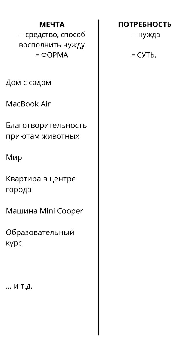 1. Выпишите свои мечты. 2. Напишите признаки/ассоциации/свойства мечты. 3. Напротив мечты напишите потребность, которую она