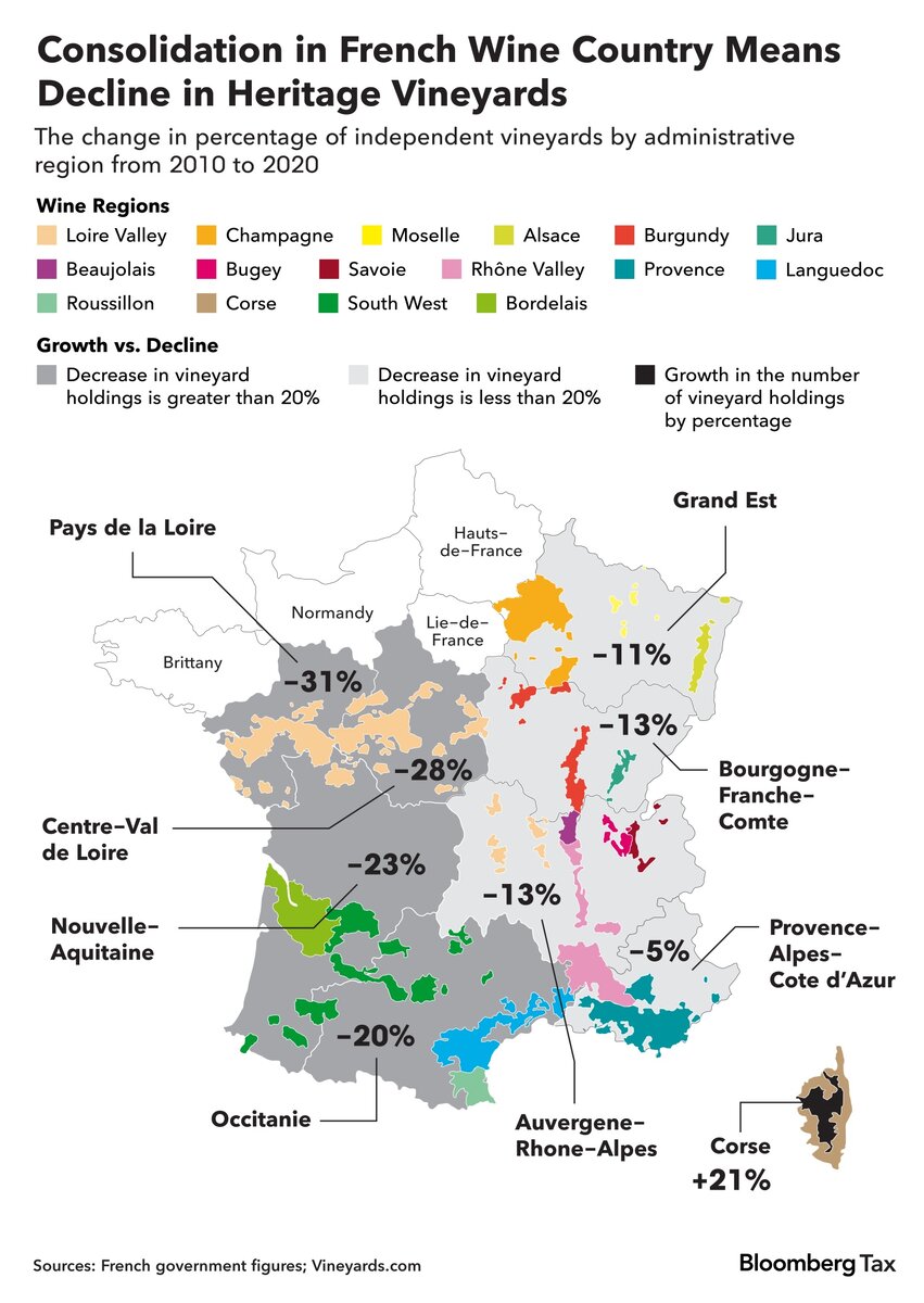 Недавно блумберг разместил статью по поводу усиления консолидации земельных участков во Франции, на которых традиционно выращивают виноград для производства вина, т.е. где выращивают технические сорта винограда. Речь идет о семейном бизнесе, небольших фермерских хозяйствах, которые наследуются следующими поколениями от предыдущих. Темным цветом выделена часть сильного сокращения виноградников, светлым-более умеренного. Суть проблемы в том, что французские фермеры стареют, 63% старше 50 лет, из 60 000 виноградников только 7 000 принадлежат семейным фермерствам. А интерес различного рода инвесторов, от зарубежных до компании LVMH, серьезно увеличили стоимость земли, в то же время такое увеличение не может быть компенсировано стоимостью производимого вина. Налогообложение земли зависит от цены актива, в данном случае- виноградников, что создает проблемы для наследников данного актива, поэтому семейных ферм становится все меньше. Наследники выбирают между комфортной жизнью без особых хлоп