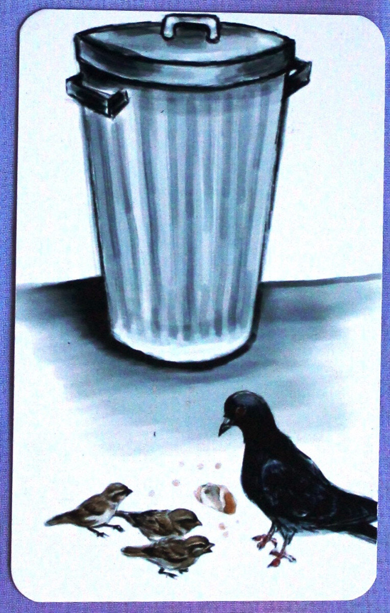 Встал утром, привел себя в порядок и приведи в порядок свою планету. Антуан де Сент–Экзюпери Какая знакомая цитата с многослойной метафорой. Привести в порядом себя, свои мысли, эмоции. Порядок на планете начинается со своего жилища, уборки, наведения чистоты. На одной из консультаций девушка, глядя на эту карту сказала "Фу, воробьи собирают крохи возле мусорного ведра, а голубь гордый, он не будет унижаться. Пусть все достанется мелким" Потом ее внимание переключилось на мусорное ведро и мысль развернулась, что можно выбрасывать, а что важно сохранить, о мусоре и ценностях. Представьте, мусорное ведро наполненное разнообразным мусором. Мы выкидываем все, что отжило свой век, что пришло в негодность, что испортилось. И нет желания перетряхивать, пересматривать этот мусор. Девушка сказала "Фу", выразила свои эмоциональные отношения к этой карте. Теперь представьте, что на дне этого мусорного ведра находится что-то действительно важное: документы, фотографии, деньги, письма... Как измени