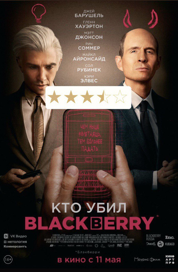 В онлайн-кинотеатрах можно посмотреть драмеди "Кто убил BlackBerry" — канадский фильм, участвовавший в основном конкурсе Берлинале 2023. Это гик-байопик, рассказывающий историю триумфа и падения компании Blackberry — той самой, которая производила понтовые телефоны задолго до появления Айфона. О том почему стоит посмотреть это кино и кому оно может понравиться — рассказываю ниже. Автобиографическая история берёт своё начало в середине 90-ых в Канаде. Двое противоположных по характеру и темпераменту гика (один — эксцентричный весельчак и фанат масскульта, второй — застенчивый и крайне некоммуникабельный ботаник) безуспешно пытаются продать свой стартап, объединяющий телефон, пейджер и компьютер в одном устройстве. Такая идея не привлекает потенциальных инвесторов из-за неубедительности проекта. Однако вскоре они находят своего ментального и материального наставника — многоликого (на это указывает обилие масок в его офисе) бизнес-менеджера, разглядевшего в их стартапе будущее. Так и нача