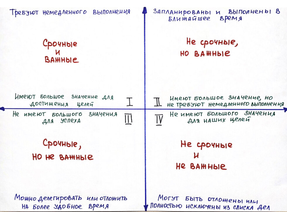 В современном мире, где каждый день мы сталкиваемся с огромным количеством задач и обязанностей, эффективное управление временем становится ключевым навыком. И одним из самых эффективных инструментов для этого является Матрица Эйзенхауэра. Матрица Эйзенхауэра – это система классификации задач, разработанная американским генералом Дуайтомом Эйзенхауэром. Она позволяет нам организовать свои задачи по приоритетам и сделать нашу работу более продуктивной. В основе Матрицы Эйзенхауэра лежит деление задач на четыре категории, основанные на их важности и срочности: Используя Матрицу Эйзенхауэра, мы можем лучше планировать свое время, концентрируясь на важных задачах и избегая прокрастинации. Она помогает нам определить, какие задачи требуют нашего первоочередного внимания, а какие можно отложить или делегировать. Чтобы применить Матрицу Эйзенхауэра в своей работе, следует следующие шаги: Матрица Эйзенхауэра является мощным инструментом для управления временем и повышения продуктивности. Она