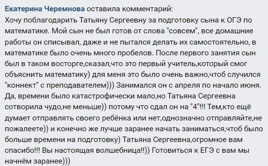 "Хочу поблагодарить Татьяну Сергеевну за подготовку сына к ОГЭ по математике.