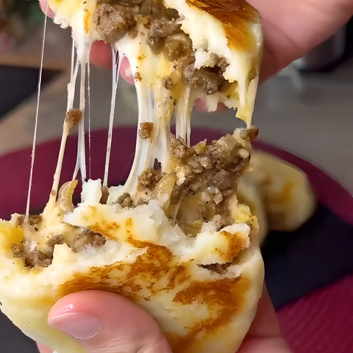 Яйцо 2шт. Приготовление: 1. Лук нарезаем на четверть кольца и обжариваем на сливочном масле. 2. Добавляем говяжий фарш, солим, перчим. 3. Добавляем специи, томатную пасту и перетертые помидоры, все хорошо перемешиваем. 4. Картофель разминаем в пюре, добавляем муку, яйца, солим, перчим и перемешиваем. 5. Формируем лепешку, в центр кладем фарш, натертый на терке сыр и обжариваем с двух сторон до золотистой корочки